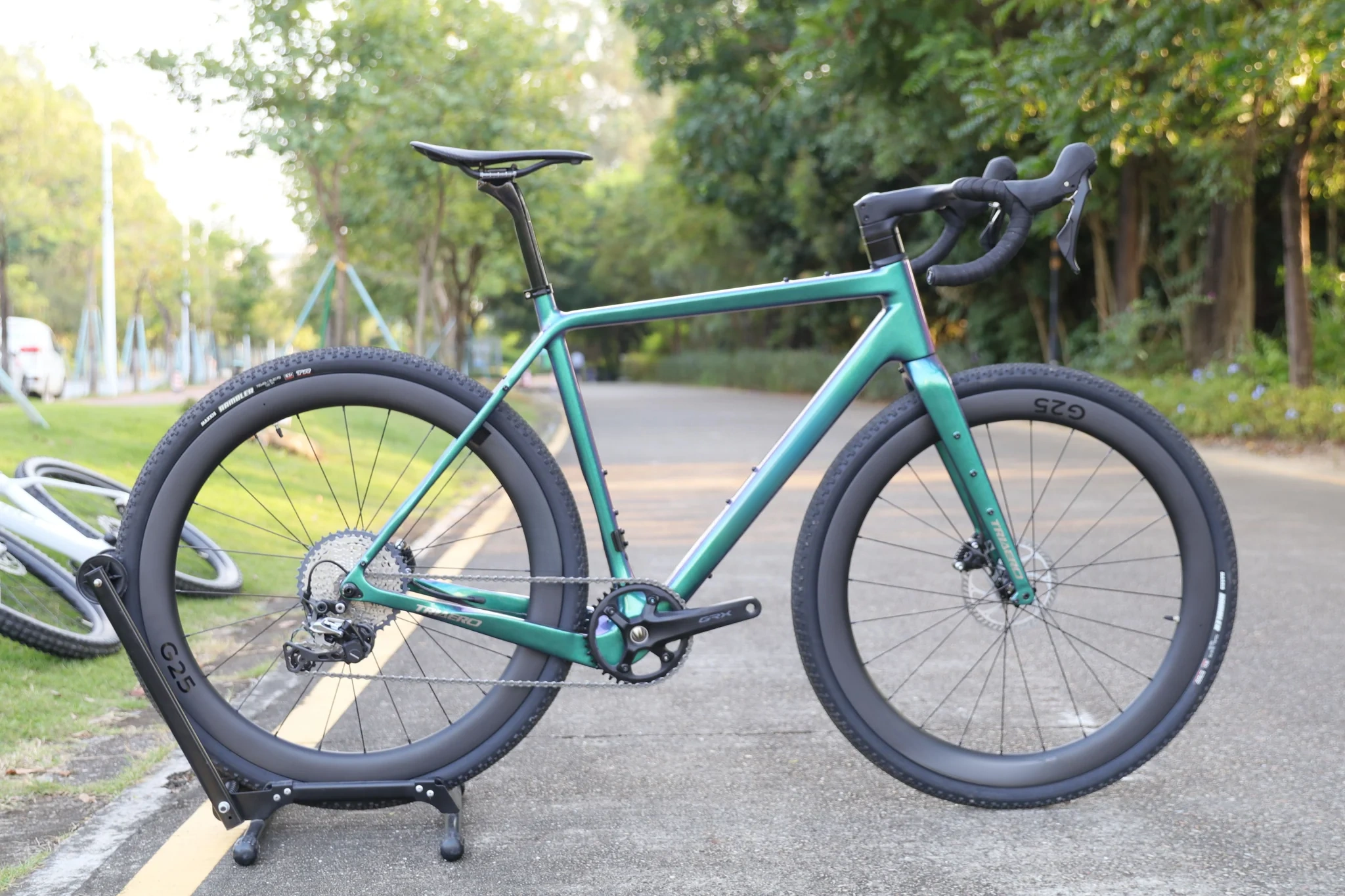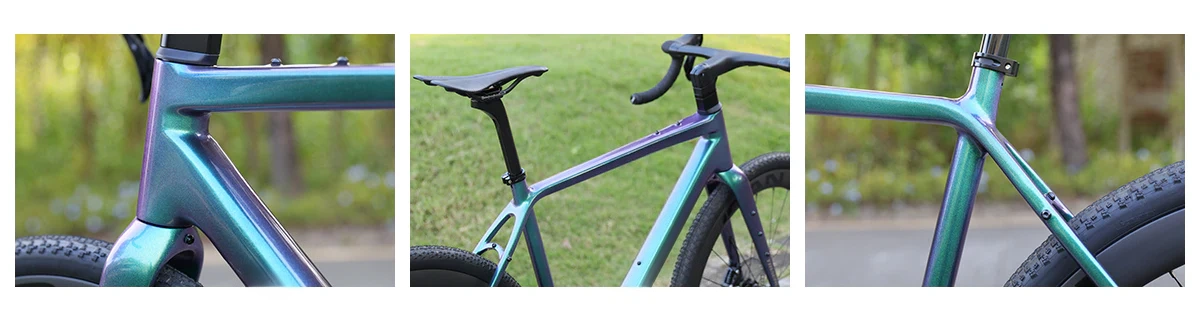 The X-gravel 2 features a complete carbon frame incorporating a lowered chainstay, providing generous clearance for tires up to 700x45mm or 27.5*1.75 inches. This design guarantees a lightweight, responsive cycling experience with outstanding control across various terrains